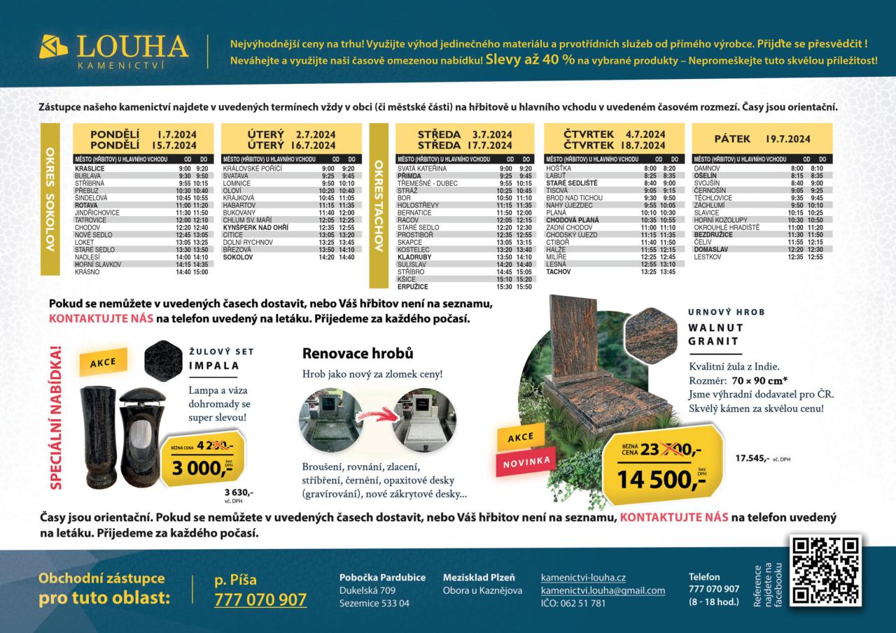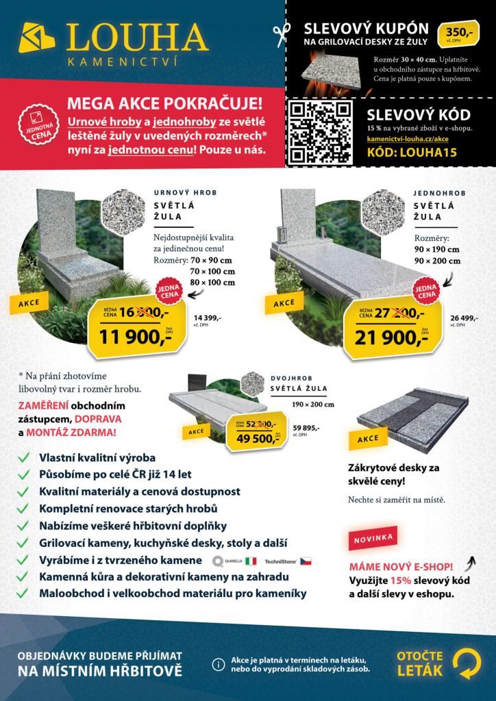 Zveřejňujeme nabídku Kamenictví LOUHA - výroba hrobů a jejich renovace. Více informací v nabídkovém letáku.