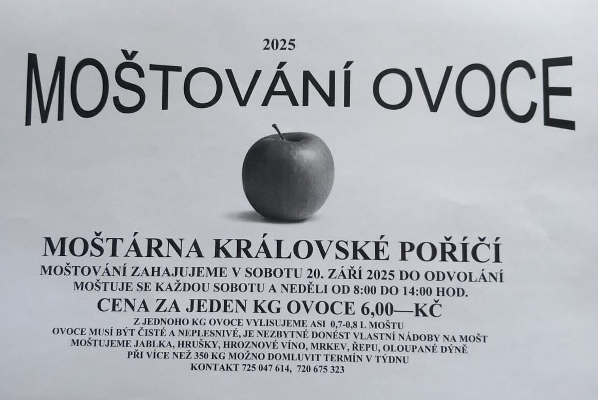 Moštárna v Královském Poříčí na adrese Dlouhá 126 zahajuje moštování už 20. září 2025. Více informací na plakátu v příspěvku.