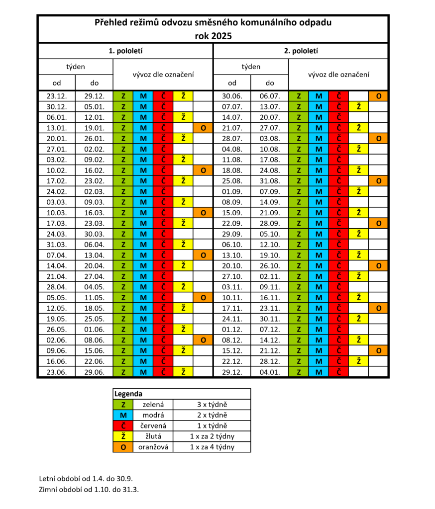 Zveřejňujeme pro Vás zde souhrnný přehled režimů svozu komunálního a tříděného odpadu od 1. 1. 2025.