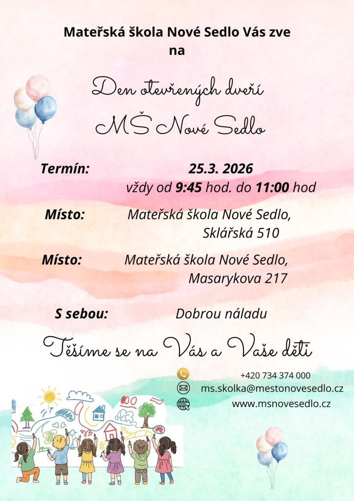MŠ v Novém Sedle zve na den otevřených dveří. Akce se uskuteční 25.3. od 9:45 hod. v prostorách MŠ. Více informací na plakátu v příspěvku.