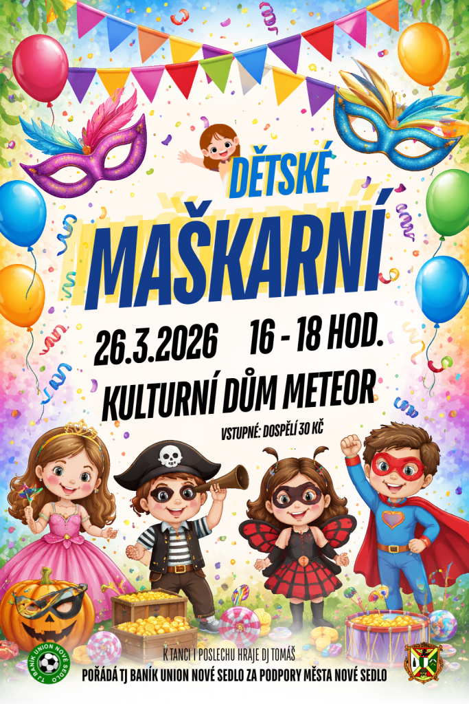 TJ BU Nové Sedlo zve naše nejmenší na dětské MAŠKARNÍ, které se uskuteční 26.3. od 16:00 hod. v KD Meteor. Více informací na plakátu v příspěvku.