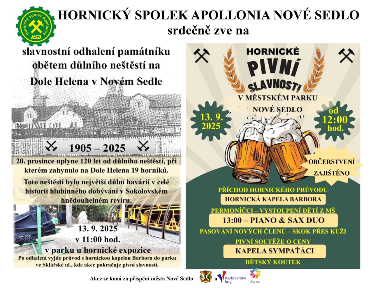 Hornický spolek Apollonia srdečně zve na hornické pivní slavnosti, které se uskuteční v sobotu 13.9.2025 od 11:00 hod. s průvodem, který vychází od hornické expozice do městského parku. Více informací na plakátu v příspěvku.