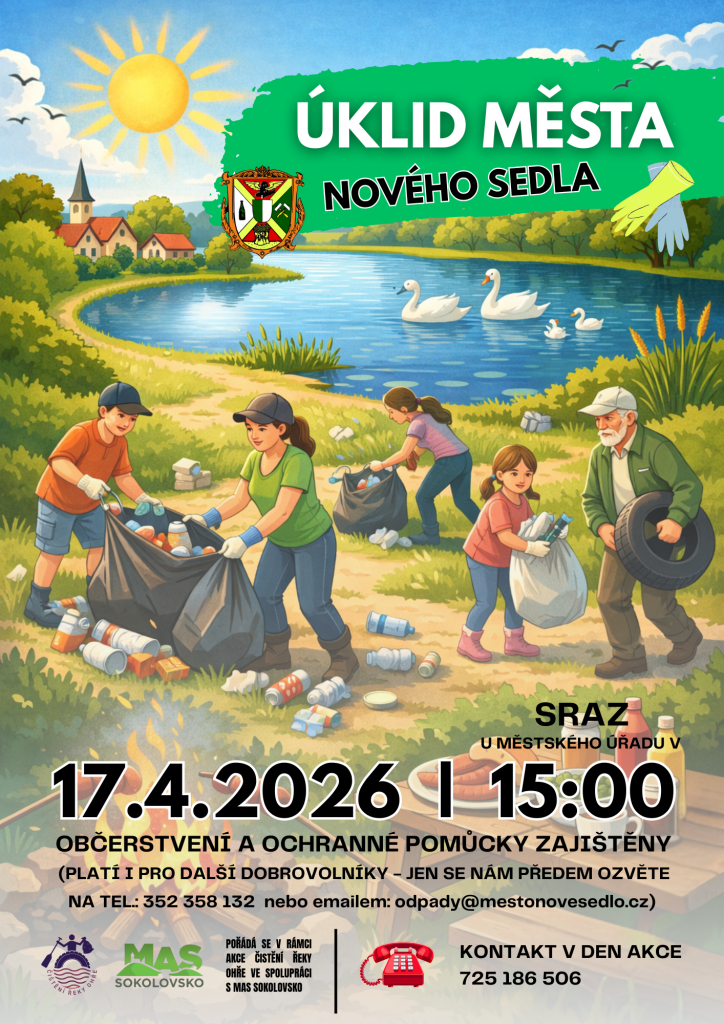 Město Nové Sedlo pořádá již tradičně v rámci akce "Čištění řeky Ohře" veřejný úklid města. Úklidová akce se uskuteční v pátek 17.4.2026 se srazem v 15:00 hod. u MěÚ. Více informací na plakátu v příspěvku.