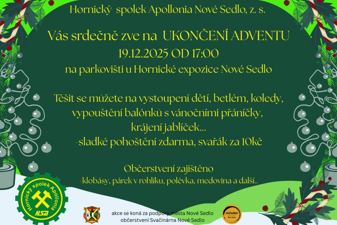 Hornický spolek Apollonia Nové Sedlo zve všechny na ukončení adventu, které se uskuteční 19. prosince od 17:00 hod. na parkovišti u Hornické expozice. Čeká vás doprovodný program a občerstvení. Více informací na plakátu v příspěvku.